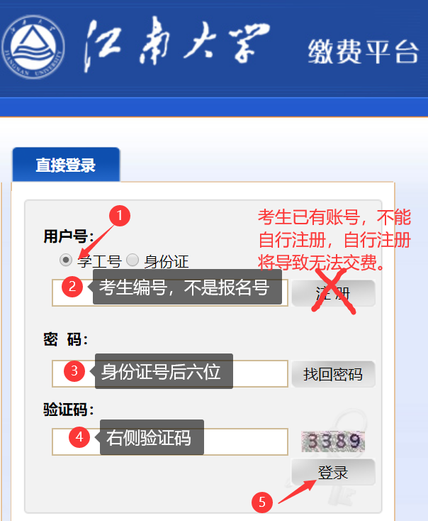 缴费说明:进入复试考生在学院规定的时间内登录“江南大学缴费平台”交纳复试费用,复试收费标准:80元/生。缴费网址://pay.xgyl.org/payment/。登录账号为准考证上的考生编号,登录密码为身份证后六位(友情提醒:考生账号已开通,切勿自行注册)。按照提示交费(使用网银),并打印或截图保存付费凭证。