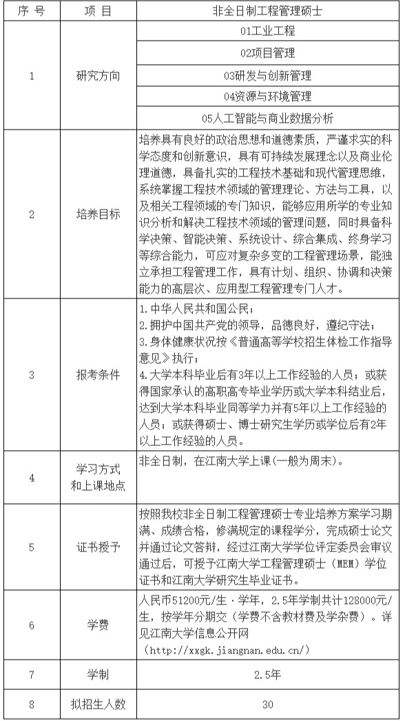 (一)我校非全日制工程管理硕士(MEM)专业不招收“单独考试”考生,无“退役大学生士兵计划”和“少数民族高层次骨干人才”计划。