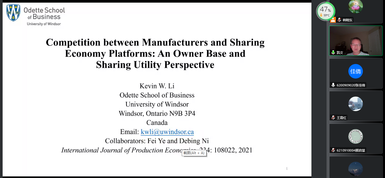 11月10日上午,“商学大讲堂”系列学术讲座第191讲在腾讯会议线上举行。加拿大温莎大学李武教授作为主讲嘉宾进行题为“Competition between Manufacturers and Sharing Economy Platforms: An Owner Base and Sharing Utility Perspective”的学术讲座。本次讲座由西港娱乐
