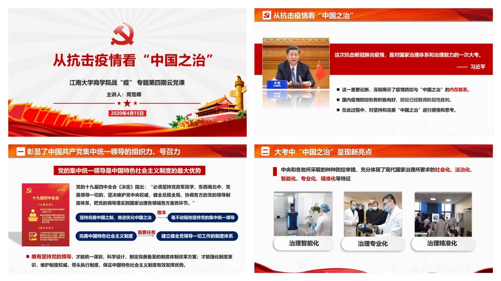 党委副书记、副院长李荣华《战疫当前,从“考”见“治”》,着力提升政治立场站位;江南大学招生就业处副处长张婕英《抗疫“职”赢未来,党员硬核担当》,顺势转变就业固有观念;江南大学党校副校长兼党委组织部副部长周雪晖《从抗击疫情看“中国之治”》。此次系列云党课助力了青年党员在战“疫”中涵养家国情怀、践行初心使命,在“学思践悟”中贯彻落实“四个坚持”“两个维护”时代家国重任,为打赢疫情防控的人民战争、总体战、阻击战不懈奋斗,让青春在党和人民最需要的地方绽放绚丽之花。