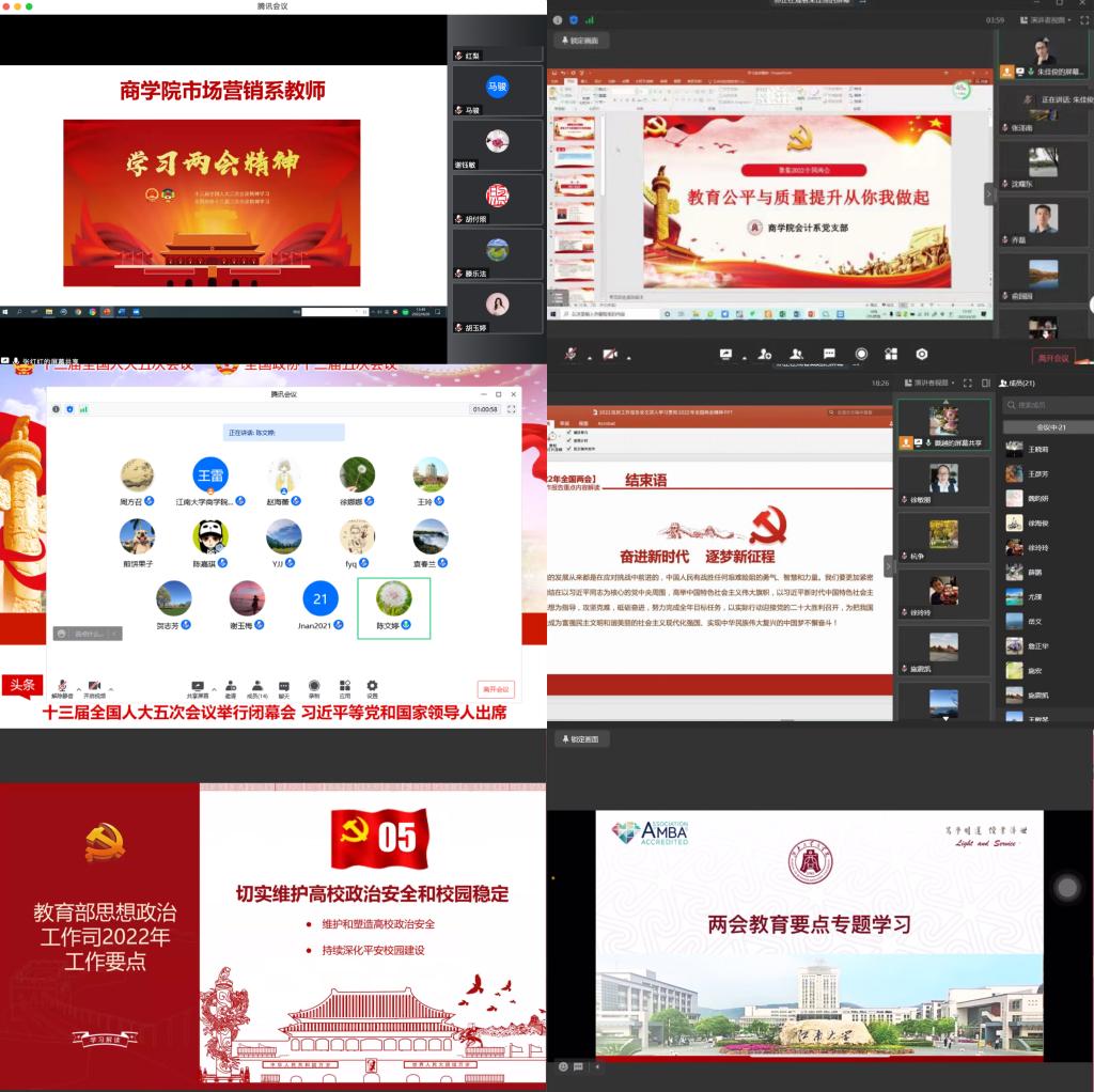 浦徐进院长首先谈到,今年我们党将召开二十大,是党和国家事业发展进程中十分重要的一年。全国两会的胜利召开,对于在新征程上凝聚奋斗力量、书写新的华章具有重要意义。政府工作报告回顾总结了过去一年我国发展取得的新的重大成就、明确了2022年经济社会发展总体要求和政策取向、部署了2022年政府工作任务,充分肯定2021年教育工作,围绕“促进教育公平与质量提升”部署了2022年教育重点工作。他重点从《政府工作报告》中对“推进高等教育内涵式发展,分类建设一流大学和一流学科,加快培养理工农医类专业紧缺人才,支持中西部高等教育发展”等问题展开专题交流,他从新发展阶段如何实现更高质量的内涵式发展,就《关于深入推进世界一流大学和一流学科建设的若干意见》中提出的八个方面的建设重点分享体会,同时从“一个目标、两项行动、三大体系、四项工程、五类指标”具体阐释了《江南大学“奋进计划”(2021-2030年)》内容,并结合西港娱乐 发展情况,对如何更好融入和造就“更强的学科、更强人才、更强师资”建设目标提出了要求。与会成员结合分管工作和学院情况,就围绕国家重大战略实施,激发商科创新活力和潜能,进一步提高服务区域发展能力;积累办学建设成果,扩大对外开放;持续深化教育评价改革,提高人才培养质量;关注好毕业生就业,统筹抓好疫情防控和学院各项事业发展等方面进行了学习讨论。