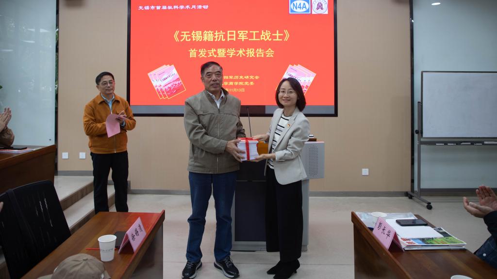 赠送《无锡籍抗日军工战士》一书,双方代表肖根荣和孙小芳上台完成赠授仪式。