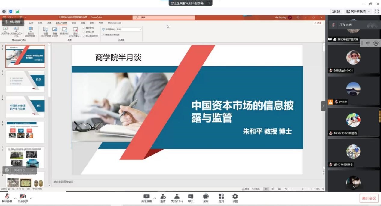 讲座尾声,朱教授从会计专业角度出发,通过对一个经典报表的分析,让同学们理解到认识报表是剖析、解读上市公司财务状况、经营成果和现金流等信息和资本市场动态发展的基础,也是广大商科学子了解中国经济形势的基本工具。听完讲解,同学们对报表有了更加深刻的理解,表示在以后学习中要利用好朱教授所讲授的知识,更加客观和全面地完成报表解读和分析。