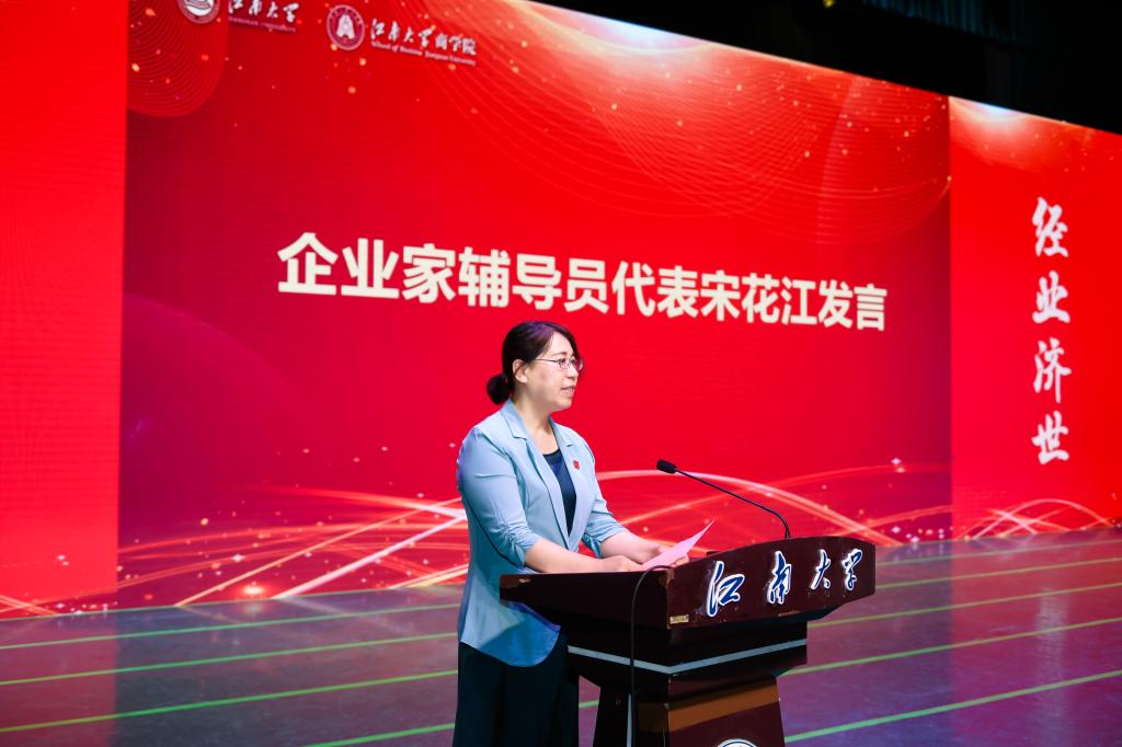 企业家辅导员作为学院校企协同育人模式的中坚力量,四年来,给予了商院学子许多指导与帮助。典礼上,毕业生带班企业家辅导员代表、企业家辅导员主席团副主席、无锡意凯自动化技术有限公司董事长宋花江女士发言,宋女士精彩生动的向同学们分享了自己的成长感悟,祝福同学们各自奔赴美好未来,鼓励同学们努力奋斗,积极进取,敢于直面困难,勇于把握机遇,引发了同学们的深思、鼓舞了同学们的斗志。