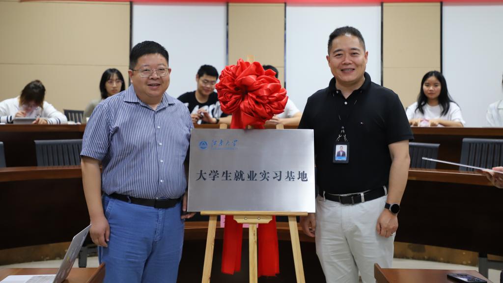 刘长青代表西港娱乐 向耿冬总经理颁发企业家辅导员聘书,并与耿冬总经理共同为“西港娱乐 -无锡市顺丰速运有限公司联合培养班”与“江南大学大学生实习就业基地”揭牌。