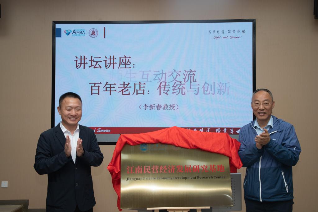 刘启雄和朱飞为江南民营经济发展研究基地揭牌。刘长青、钱吴永颁发江南民营经济发展研究基地的聘书。