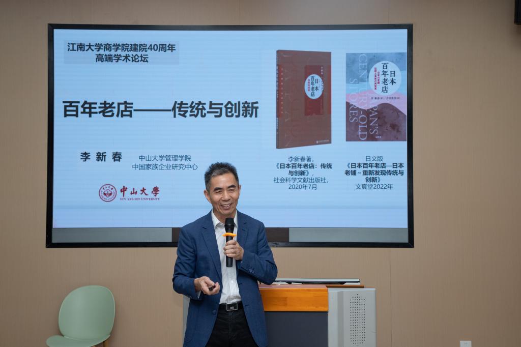 李新春教授以“百年老店:传统与创新”为主题作报告。他以可持续性与创新的百年老店作为切入点,系统阐释了百年老店不仅是一个历史的存在,更关系到当代企业的可持续成长问题。同时,他将日本与西方的百年老店、长寿家族企业进行对比,通过日本多个百年老店的案例分析,指出企业长寿的秘诀是勤勤勉勉工作和不断创新。此外,他提出百年企业应专注于适应时代变化、重视经营价值体系、传承文化传统、推动代际创新,并将质量创新置于产品创新之上,从而实现传统与创新的有机融合。