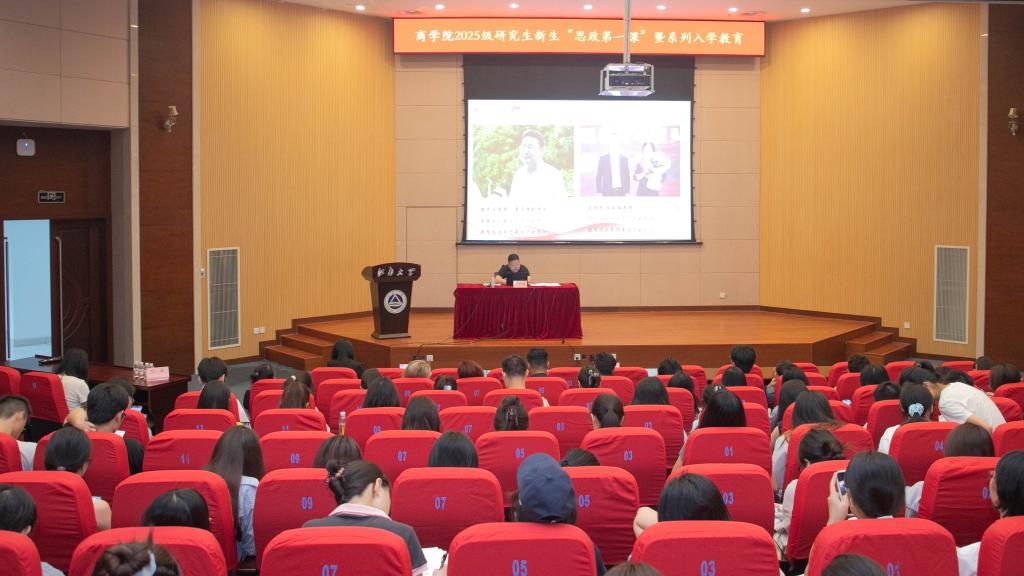 刘长青以《数智时代商科人才培养的“变”与“不变”》为题,讲授“思政第一课”。他首先向全体研究生新生致以衷心祝贺与热烈欢迎,随后回顾9月3日纪念中国人民抗日战争暨世界反法西斯战争胜利80周年阅兵仪式,引导新生深刻感悟时代赋予的责任与使命。接着,他围绕“时代之‘变’:百年未有之大变局”“坚守之‘不变’:商科青年的使命担当”“行动之‘策’:把握变与不变,在变局中开新局” 三方面展开系统阐述。他深入剖析国际局势变化及中国应对策略,解读数智浪潮对商科格局的重塑及数智技术对教学生态的重构,以著名经济学家案例启示青年学子传承企业家精神,弘扬“笃学明道、经业济世”的院训精神,并寄语青年在思想层面坚定正确道路,在行动层面练就过硬本领。
