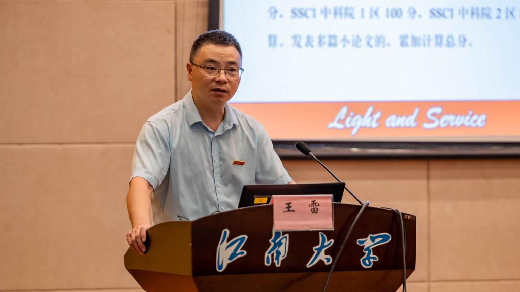 王雷作研究生入学暨科学道德与学风建设主题教育。他首先向全体研究生表示衷心祝贺与热烈欢迎。接下来,他就学校、学院发展概况作简要介绍,并围绕提高研究生教育质量的相关举措、全日制硕士研究生论文答辩与学位申请的有关规定、校级优秀硕士论文评选推荐办法、江南大学研究生学位论文学术不端行为检测及结果处理办法、研究生科学道德与学风建设五方面进行系统阐述。他鼓励新生构建合理知识结构、掌握研究方法、学会论文写作、注重身心健康,并多交流、多阅读、多发表,在江南大学学有所成。