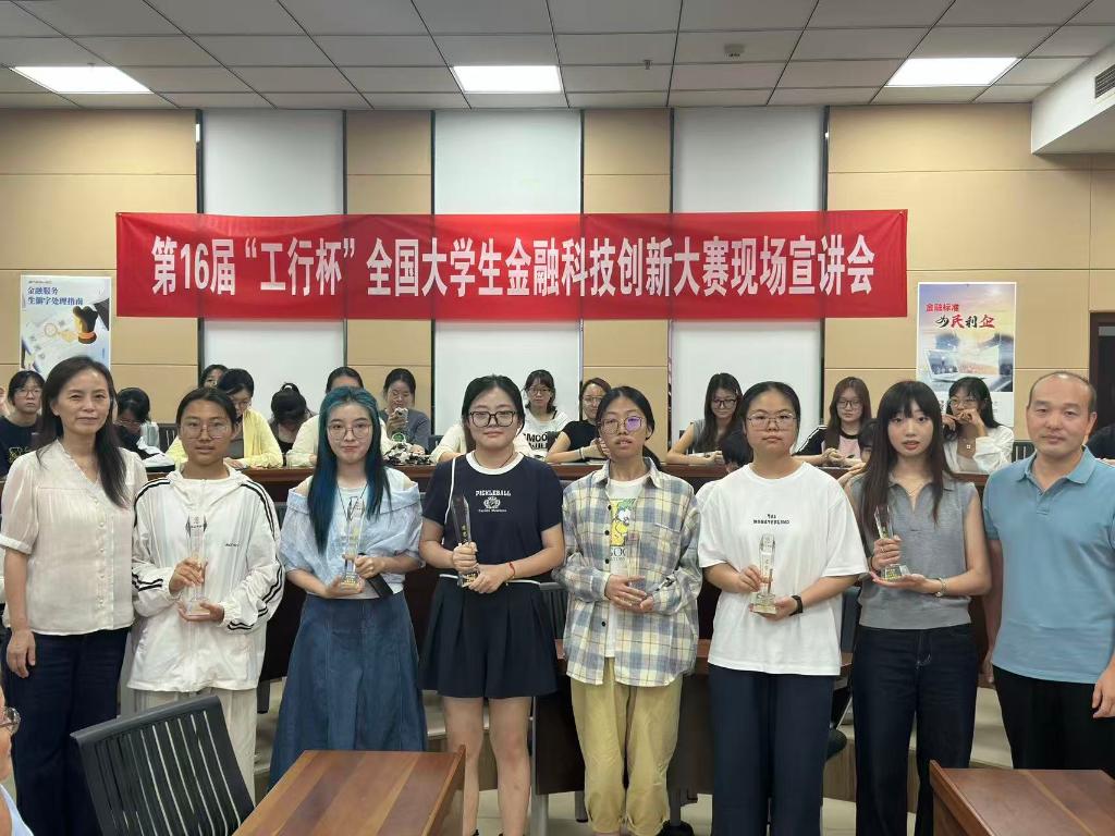丁珮瑾与刘勇共同为第十五届“工行杯”全国大学生金融科技创新大赛江苏省赛获奖学生代表颁奖。西港娱乐 学子荣获江苏省级一等奖1项、省级二等奖2项、省级三等奖4项的佳绩。获奖代表上台领奖时,现场掌声不断,充分展现了西港娱乐 学子在金融科技创新领域的优异成果。