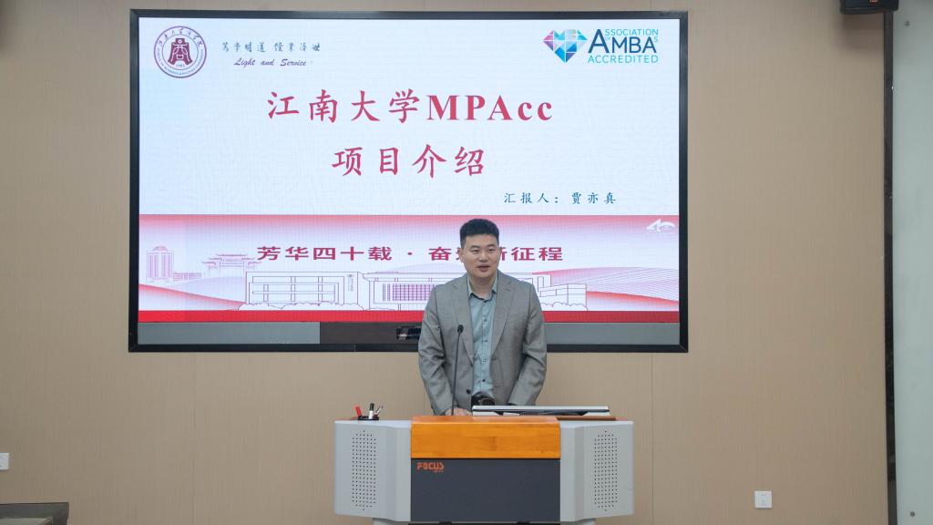 MPAcc项目主任贾亦真副教授随后作《项目培养与建设汇报》。他从项目背景、培养目标、师资建设、课程体系、实践教学与行业合作等方面进行了详细介绍,强调项目将依托长三角区位优势与江南大学“双一流”学科资源,构建“课程—案例—实践”一体化的人才培养体系。