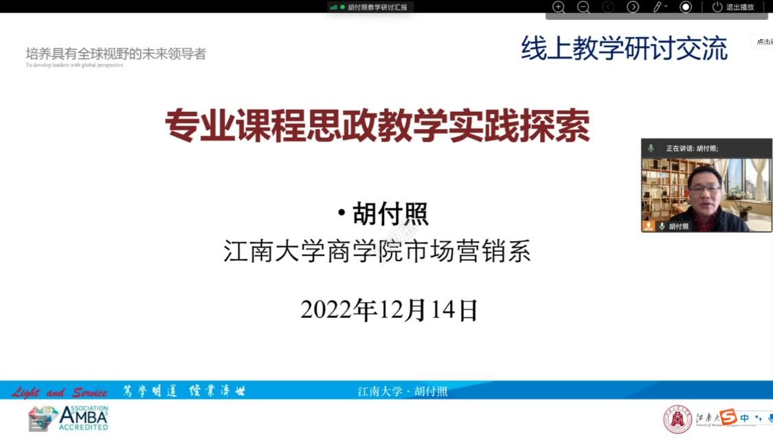 主办的专业课程思政教学实践研讨会在企业微信线上会议成功举办。研讨会邀请市场营销系副教授胡付照主讲。来自学院的系部主任、青年博士教师、硕士生、本科生等近30人线上参与研讨。