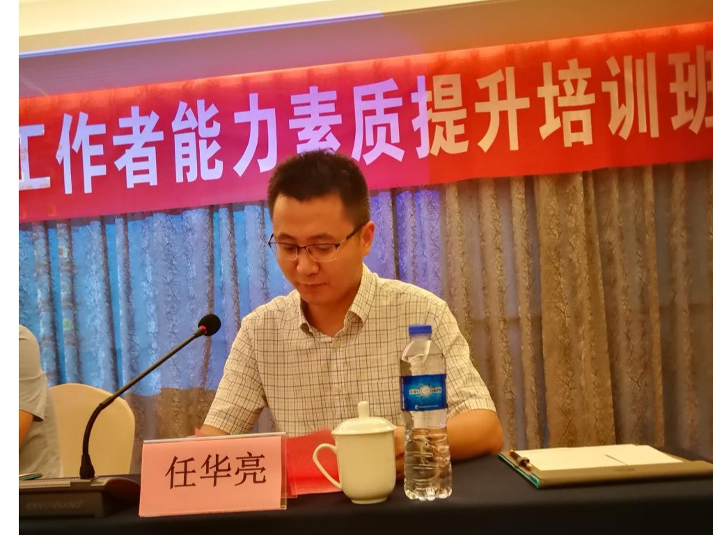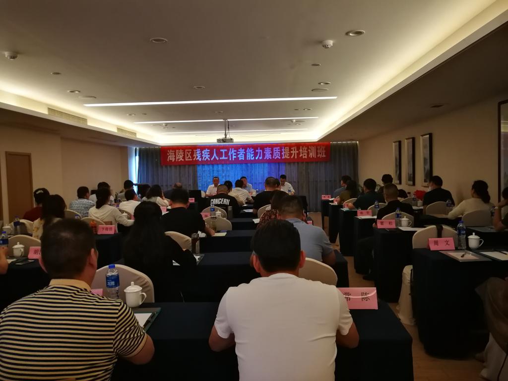 院长助理任华亮致欢迎辞。40名海陵区残疾人工作者参加了本次开班仪式。