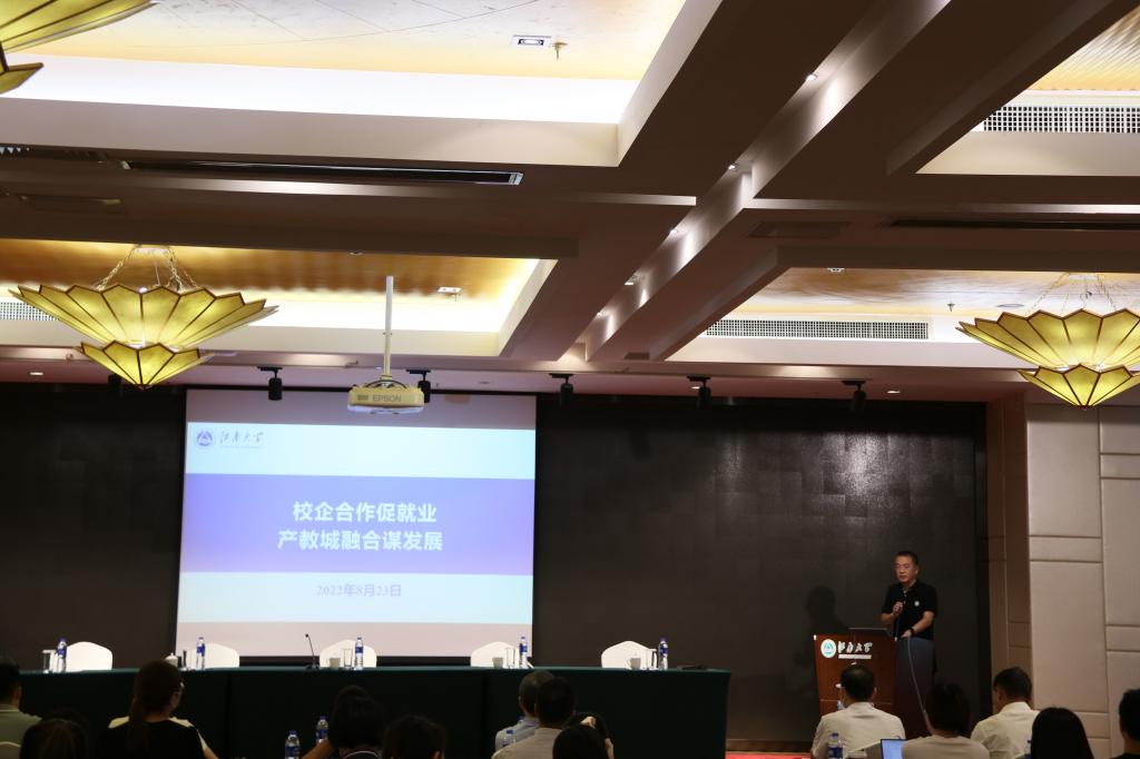紧接着,赵建新处长发表了主题为校企合作促进就业产教城融合谋发展的讲话。他简要介绍了江南大学的发展历程,用历年的招生和就业数据说明江南大学毕业生的培养质量、特点与优势,希望进一步加深江南大学与各上市公司相互了解,促进彼此交流与合作。