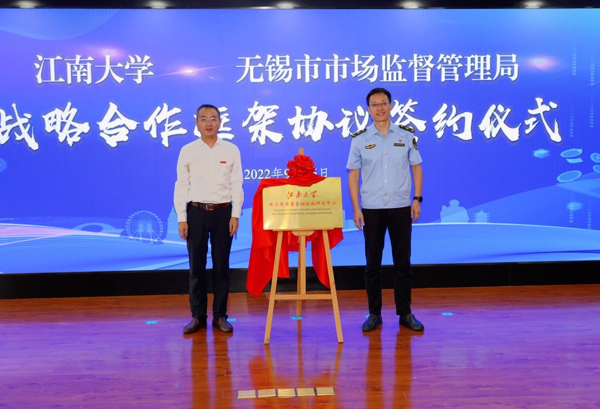 院长浦徐进与市场监督管理局所属检验检测认证研究院院长鲍军签署了《共建合作框架协议》,会上双方还进行了“江南大学长三角质量基础设施研究中心”等校地合作研究机构的揭牌。
