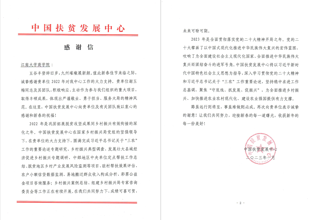 谢玉梅同志及其团队,积极响应、主动作为参与中国扶贫发展中心组织的重大项目, 取得丰硕成果, 体现出严谨敬业、勇于担当、服务大局的精神风范。2022年7月至8月,谢玉梅同志及其团队赴广西凌云县和乐业县、重庆酉阳县和彭水县、贵州务川县和榕江县进行调研,针对国家乡村振兴局在我国160个国家级乡村振兴帮扶县开展的“富民贷”金融产品落实情况进行评估,结合2000户电话问卷及实地调研撰写了调研报告,对进一步完善金融助力乡村振兴提出了建设性意见。