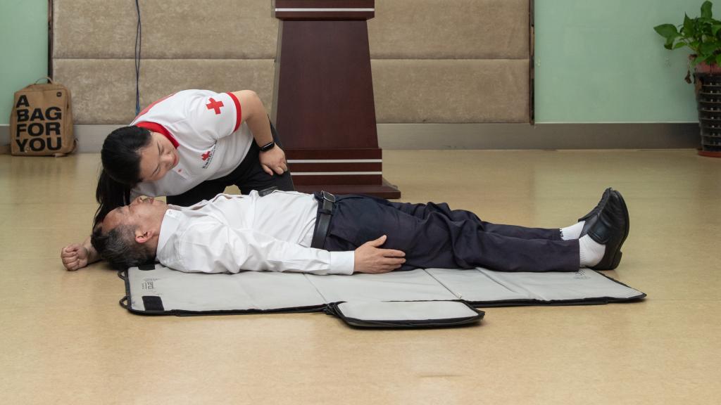 培训现场精彩纷呈,老师们认真聆听、踊跃问答,大家争先恐后练习体验了急救的规范程序,郭建伟老师自告奋勇出列扮演待救助的病员,生动有趣的表演让大家忍俊不禁。最后在红十字会的谈晓颖和徐亚军、校医院的江虹这三位应急救护培训讲师的严格监督下,每位老师都通过了当堂笔试和实际操作考核。