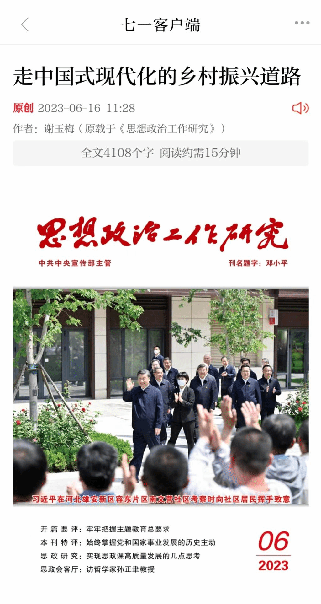 谢玉梅教授学习二十大精神文章“走中国式现代化的乡村振兴道路”,2023年6月16日上线学习强国,五天阅读量突破10万余人,并获七一客户端全文转载。