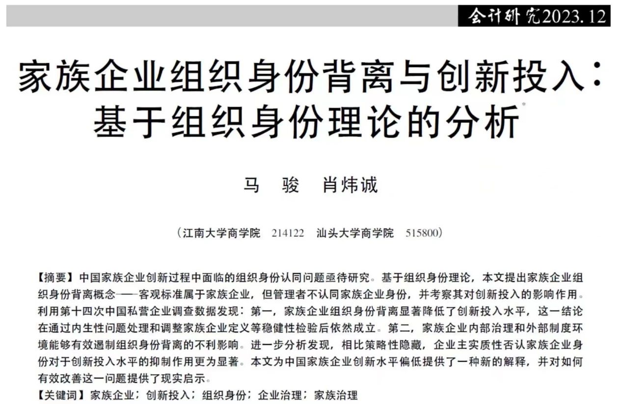 马骏副教授与合作者共同完成的论文“家族企业组织身份背离与创新投入:基于组织身份理论的分析”在《会计研究》期刊正式刊出。《会计研究》杂志是财政部主管、中国会计学会主办的国家一级学术期刊,是国家自然科学基金委员会确定的管理科学A类重要期刊,是CSSCI来源期刊中唯一的会计类学术期刊,是中文会计学顶级期刊,也是江苏省哲学社会科学规划办公室认定的权威刊物。