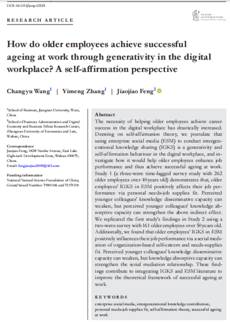汪长玉教授、江南大学2022级硕士研究生张奕萌和中南财经政法大学冯娇娇副教授(通讯作者)共同完成的论文“How do older employees achieve successful ageing at work through generativity in the digital workplace? A self-affirmation perspective”。汪长玉教授为本研究的第一作者。