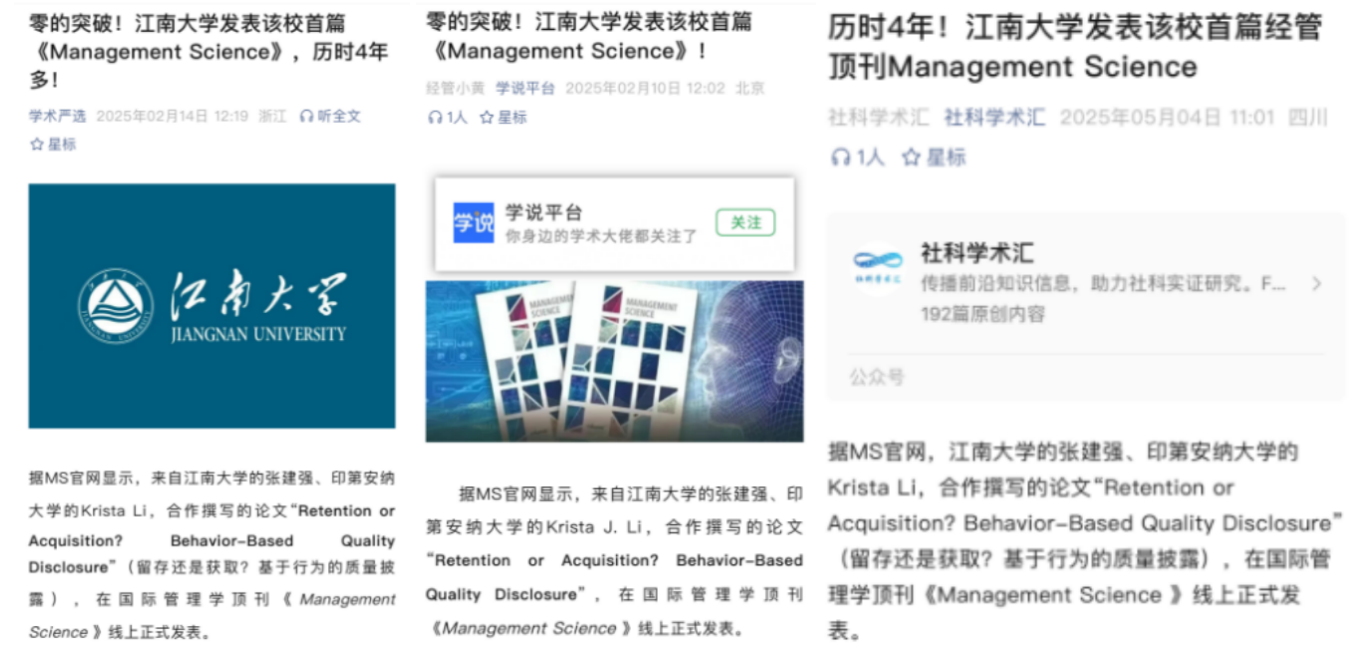 张建强教授作为第一作者与印第安纳大学Krista Li教授合作的论文“Retention or Acquisition? Behavior-Based Quality Disclosure”在国际运筹学与管理科学领域顶级期刊《Management Science》在线发表,实现了江南大学在该期刊发表论文“零”的突破。