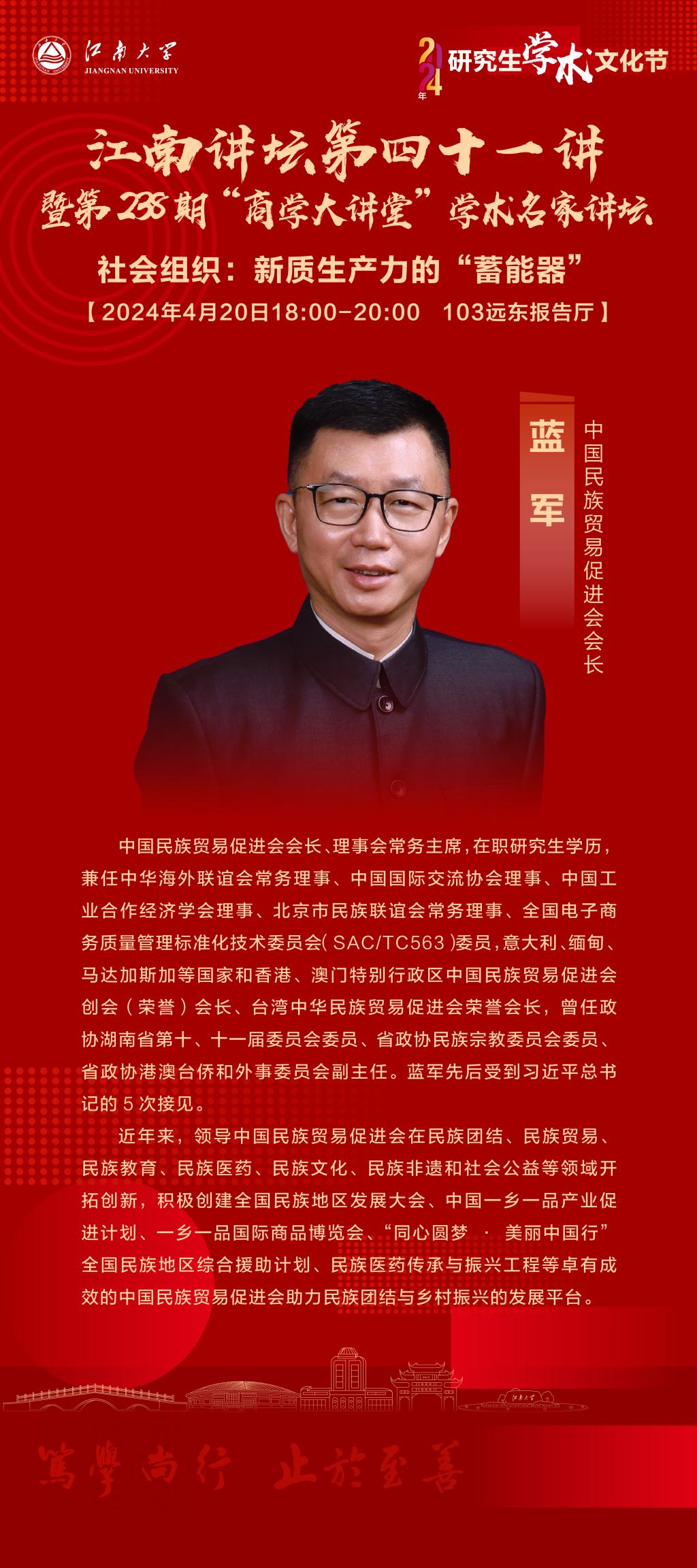 蓝军,中国民族贸易促进会会长、理事会常务主席,在职研究生学历,兼任中华海外联谊会常务理事、中国国际交流协会理事、中国工业合作经济学会理事、北京市民族联谊会常务理事、全国电子商务质量管理标准化技术委员会(SAC/TC563)委员,意大利、缅甸、马达加斯加等国家和香港、澳门特别行政区中国民族贸易促进会创会(荣誉)会长、台湾中华民族贸易促进会荣誉会长,曾任政协湖南省第十、十一届委员会委员、省政协民族宗教委员会委员、省政协港澳台侨和外事委员会副主任。蓝军先后受到习近平总书记的5次接见。