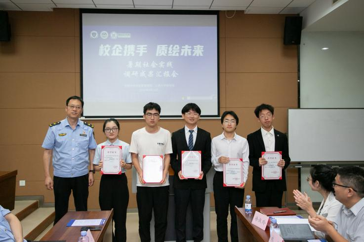 无锡市市场监督管理局总工程师谢刚为西港娱乐 社会实践团队颁发荣誉证书,向五支“校企携手,质绘未来”西港娱乐 暑期社会实践团队表示了衷心祝贺。