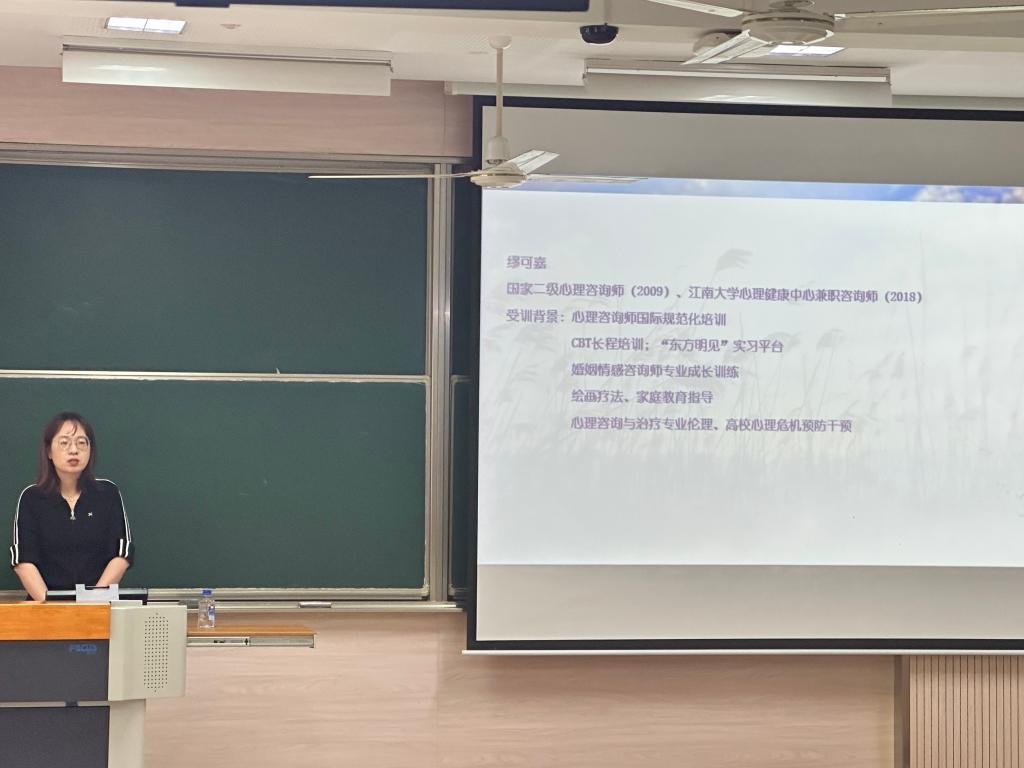 当今社会对大学生的要求越来越高,心理健康成为在工作学习上发挥智力水平,积极从事社会活动和不断向更高层次发展的重要条件。缪老师向同学们介绍了江南大学心理中心并提供了多种校内心理咨询服务的预约方式,希望同学们在遇到心理问题时可以积极寻求心理中心的帮助。