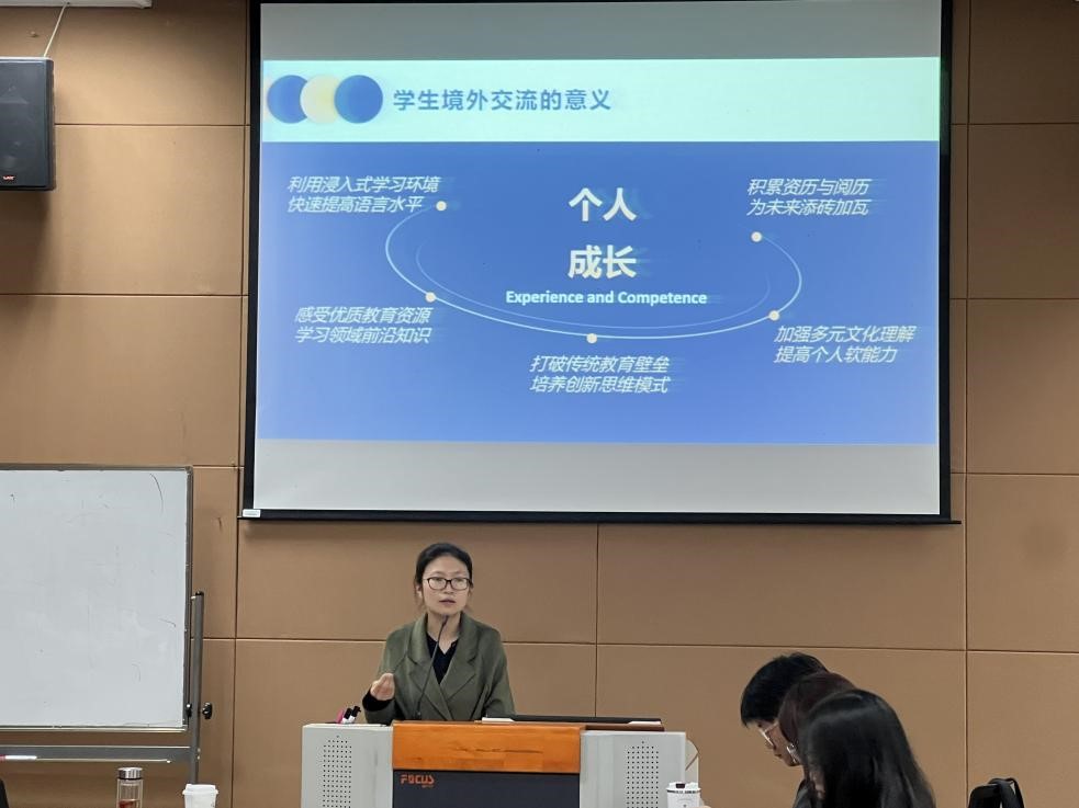 刘舒皎老师解读了学校海外交流相关政策、项目介绍与规划,让同学们对于海外留学有了更加深入的了解。并结合自身多年负责留学管理服务的经验进一步地介绍了海外留学的意义,鼓励同学们利用浸入式学习环境,快速提高语言水平;感受优质教育资源,学习领域前沿知识;打破传统教育壁垒,培养创新思维模式;加强多元化理解,提高个人软实力;积累资历与阅历,为未来添砖加瓦。随后,刘老师耐心系统地为同学们讲解了大学四年海外交流生涯规划轴,进一步明确了学生海外交流的目标和方向。