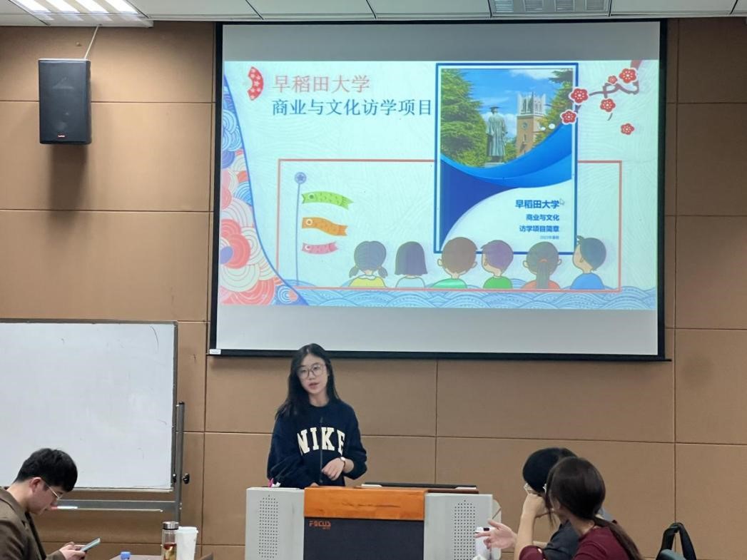 罗筱璐同学分享了她暑期在日本早稻田大学的游学经历。她将学、思、行、乐完美融合,用一张张照片真实地展示了当地的风土人情与地域文化。她以人工智能为切入口,讲述了日本的工业发展和全球进入数智时代后对当代大学生在人工智能和大数据方面技术的具体要求,对比分析了日本和中国在企业劳动报酬等方面的异同。通过视频和文字的分享,让同学们对海外游学有了更浓郁的热情和更深入的了解。