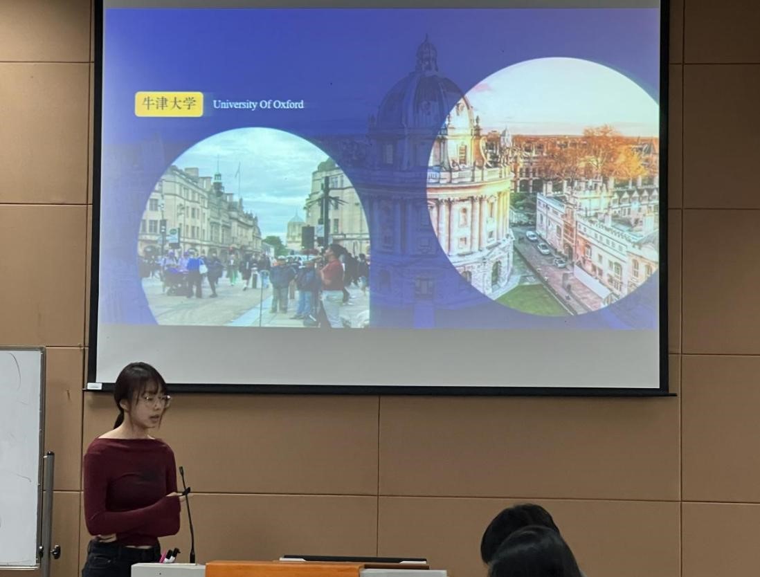 乔偌婷同学以“城市中的大学”为切入点,讲述了她在牛津大学的游学经历。牛津大学作为世界顶级名校,与城市牛津郡完美融合,被称之为城市中的大学。乔偌婷同学为同学们分享了为期半个多月在牛津的学习、生活经历,介绍了英国的风土人情和文化习俗。她分享到:“牛津大学的商业分析课程和小组展示给她留下了深刻的印象,让她沉浸式地感受着英文的学习环境和最新的商科理念。”同学们听了分享都对牛津大学有了更为深刻的了解与向往。