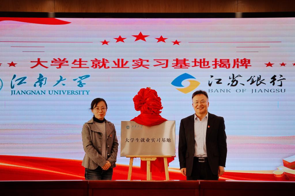校企双方领导徐长平、徐静共同为“江南大学——江苏银行无锡分行大学生就业实习基地”揭牌。未来,双方将在人才共育方面协同共进,多形式实现学生能力与银行用人服务需求的匹配,为学生提供更多实习就业的机会。