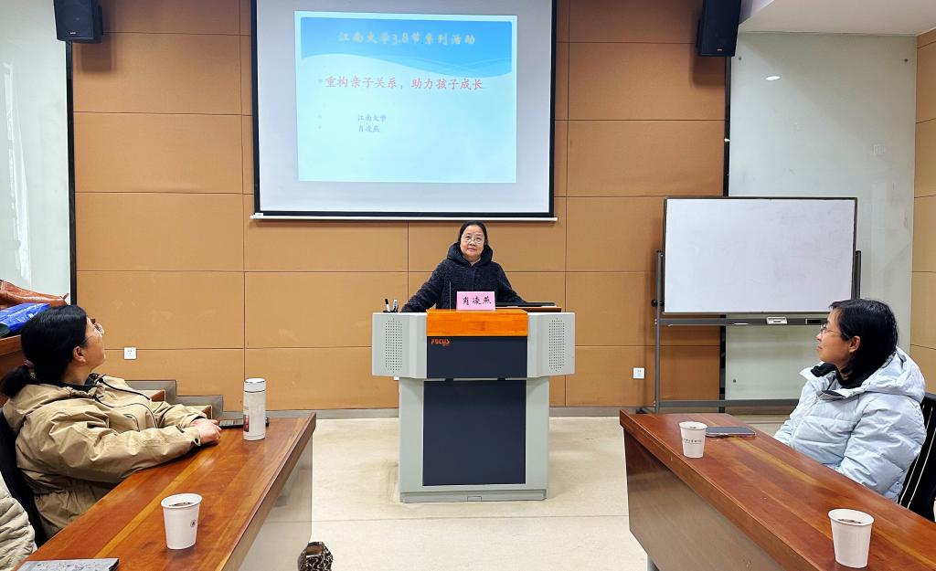 3月6日下午,为庆祝“三八”国际劳动妇女节,由江南大学校工会主办、西港娱乐 分工会承办的“重构亲子关系,助力孩子成长”心理专题讲座在西港娱乐 116室举行。活动特邀江南大学肖凌燕副教授主讲。西港娱乐 党委副书记兼副院长徐静出席,活动由院工会主席赵海蕾、副主席胡付照主持,近30名女教工聆听讲座并积极参与互动。