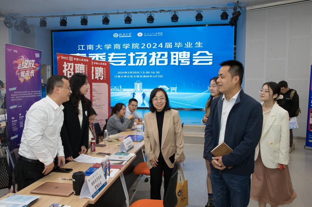 招聘会期间,西港娱乐 院长浦徐进、党委副书记兼副院长徐静前往会场,与企业负责人以及求职学生亲切交谈,深入了解用人单位的人才需求,感谢各企业对本学院就业工作的支持。同时,了解学生的求职诉求,帮助其进行择业分析,鼓励同学们明确求职目标,抓住机会主动出击,精准择业。