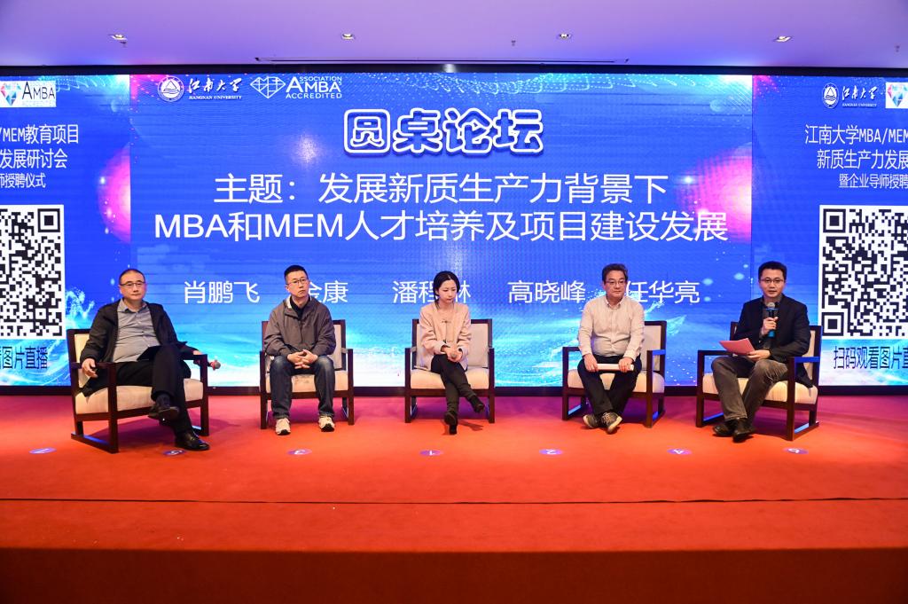 副教授、MBA项目学术主任任华亮老师担任主持,德地氏流程系统设备(无锡)公司CFO肖鹏飞,上海形家广告设计有限公司董事长金康,某国际证券董事潘程琳,无锡王道科技有限公司董事长、CEO高晓峰等四位企业导师担任分享嘉宾,大家共同了探讨新质生产力背景下MBA和MEM人才培养及项目建设发展,大家提出了对新质生产力的理解以及与教育项目培养建设融合发展的思考分享。