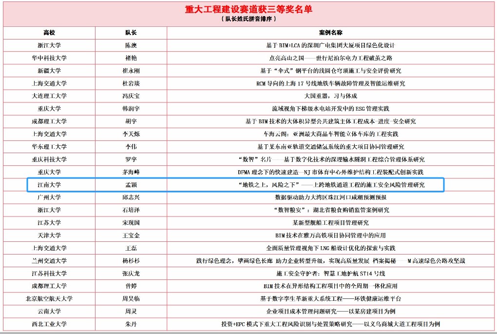 2024年10月26日至27日,第三届中国研究生工程管理案例大赛全国总决赛在北京圆满落幕。本次大赛由教育部学位管理与研究生教育司、全国工程管理专业学位研究生教育指导委员会联合指导,中国学位与研究生教育学会、中国科协青少年科技中心共同主办。经过激烈的角逐,江南大学江南轨通智行队(指导老师:浦徐进、周亦宁;团队成员:何知、张国腾、孟颖、安楠、范进龙)凭借案例《“地铁之上,风险之下”——上跨地铁通道工程的施工安全风险管理研究》荣获重大工程建设赛道全国三等奖,展现了江南学子在工程管理领域的优秀才华和创新能力。