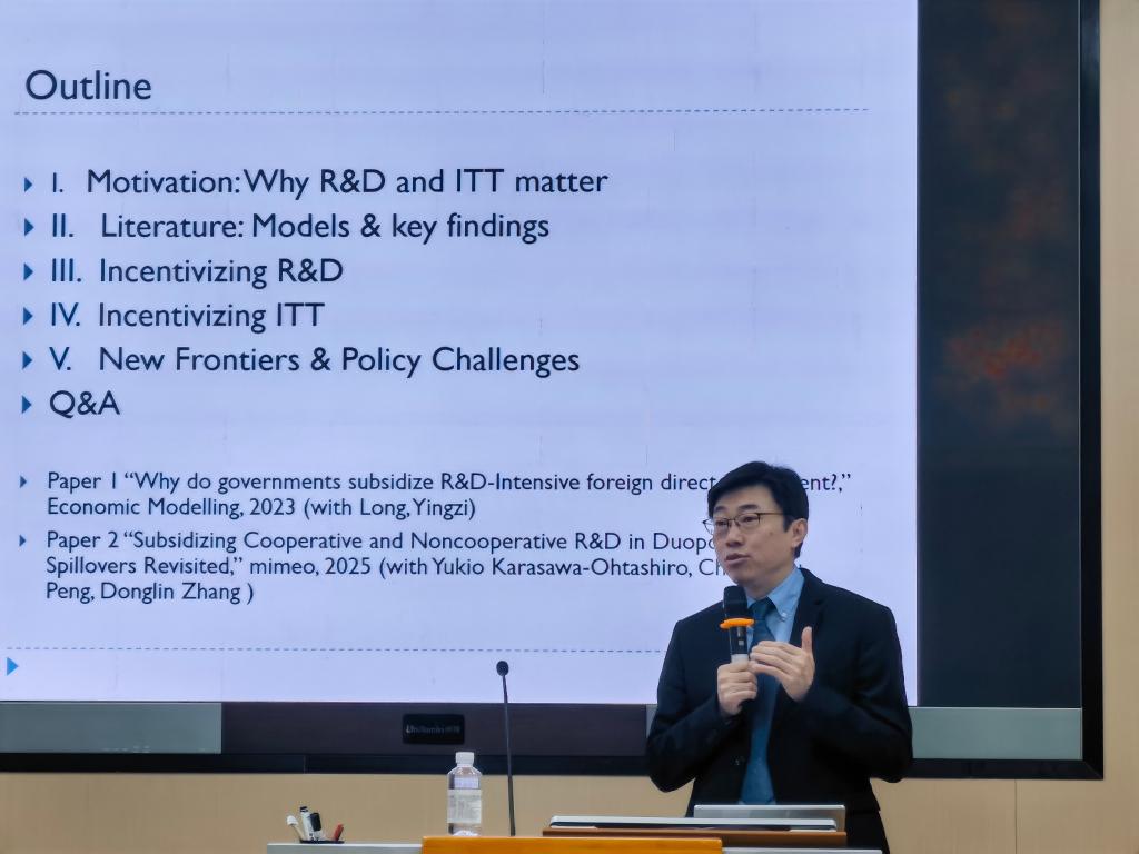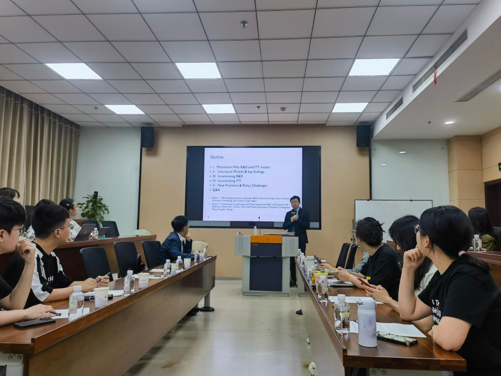 蔡大鹏教授从当前形势切入,指出在创新不确定性显著增加以及研发(R&D)成本不断攀升,各国政府纷纷加大对企业联合研发项目支持力度的背景下,深入理解研发合作所产生的战略影响以及政府支持背后的激励机制,对于企业和政府而言尤为重要。他深入分析了当研发努力从战略替代品转变为战略互补品时的最优政策,提出政府在补贴政策的制定上,应根据企业的具体情况,设计有针对性的个性化补贴,譬如对于那些创新能力较强且可能对本国产业构成竞争威胁的外国企业,可以适当采取征税措施,以保护本国企业的发展空间;而对于那些能够与本国企业形成互补、促进产业协同发展的外国企业,则可以给予一定的补贴,吸引其与本国企业展开合作,共同推动产业升级。交流环节,蔡大鹏教授热情回答了老师和同学们在研究过程中遇到的问题。