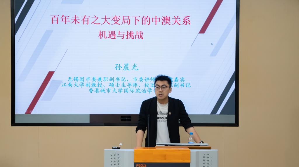 在国际形势主题讲座环节,江南大学马克思主义学院副教授孙晨光以“百年未有之大变局下的中澳关系”为主题作分享。他从历史脉络和现实挑战两个维度切入,深入剖析了当前国际形势对中澳关系的影响,勉励同学们在复杂多变的国际环境中,既要保持开放包容的心态,也要增强明辨是非的能力,做中外友好交流的桥梁。