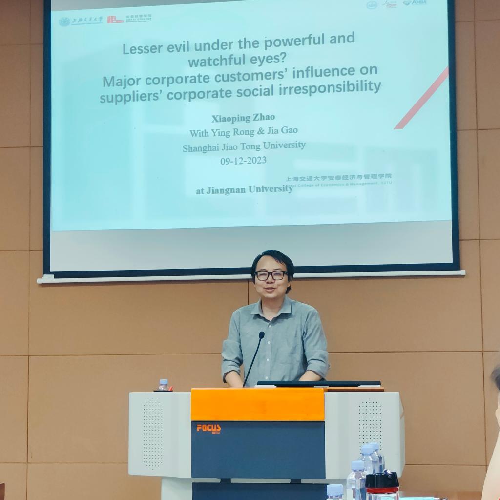 116会议室举行。上海交通大学安泰经济与管理学院赵小平副教授受邀作题为“Lesser evil under the powerful and watchful eyes? The influence of major corporate customers on suppliers’ corporate social irresponsibility(CSI)”的学术讲座。本次讲座由组织管理系主任汪长玉副教授主持,西港娱乐