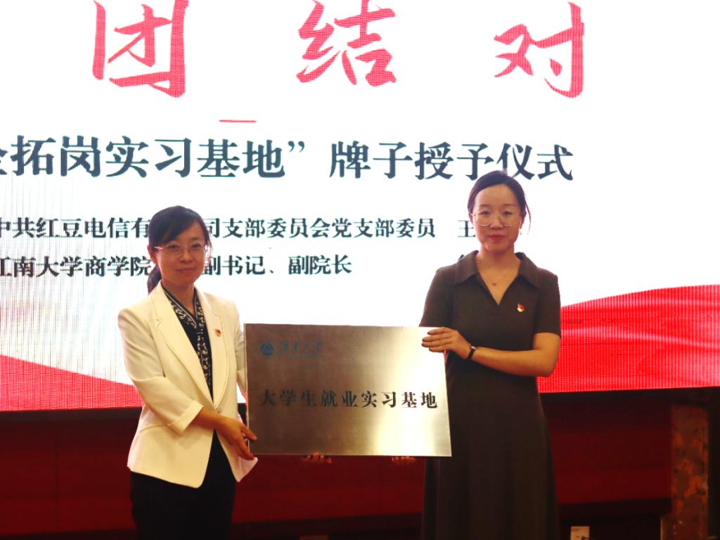随后,双方支部书记杨磊益、吴松分别代表党支部签署结对共建协议。同时,为落实党支部“五个一”工程目标,红豆电信党支部与西港娱乐 金融2102团支部党团结对,共同实现以党建带团建,以团建促党建。徐静副书记为红豆电信有限公司授予江南大学“大学生就业实习基地”工作牌。