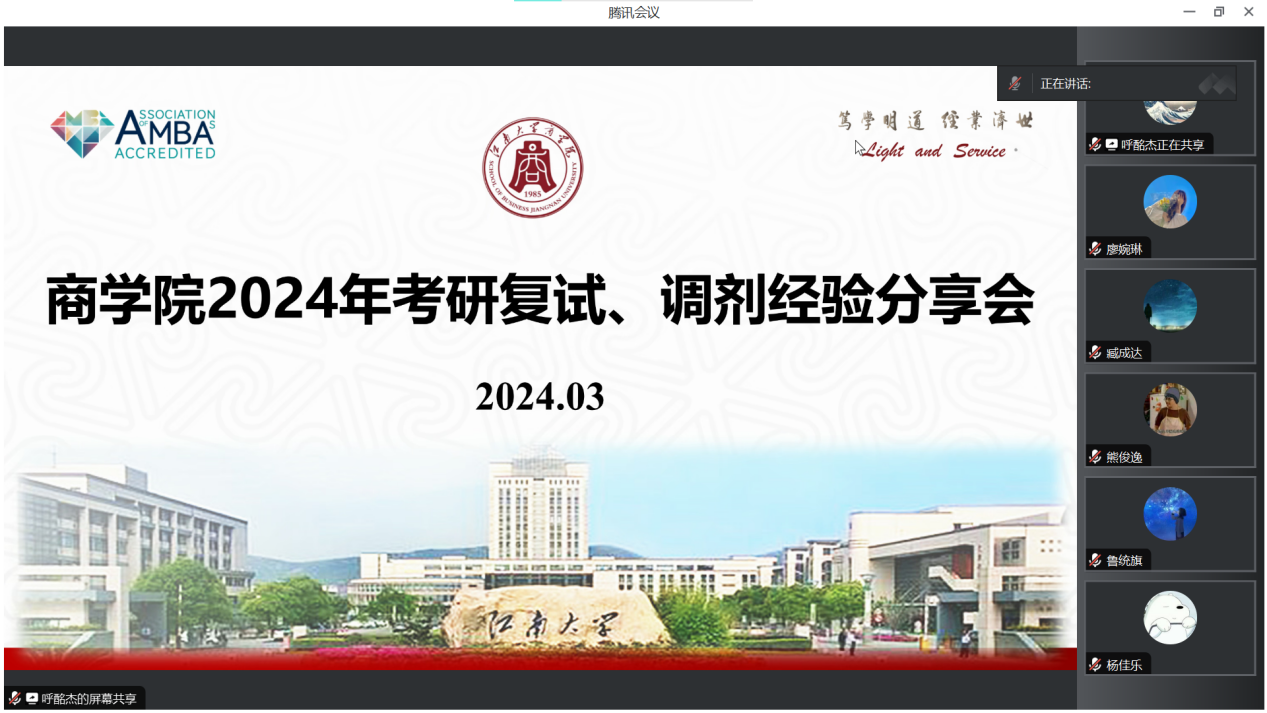 乘风助研路,奔“复”向未来。3月22日下午,西港娱乐 2024年考研复试调剂经验分享会在西港娱乐 117会议室和线上腾讯会议同步开展。本次分享会邀请了2019级高吾雨、鲁统旗、臧成达、甘晓倩,2018级李思雪五位成功上岸的学长学姐分享自己考研复试、调剂心得。共计68名2020级本科生参加分享会。