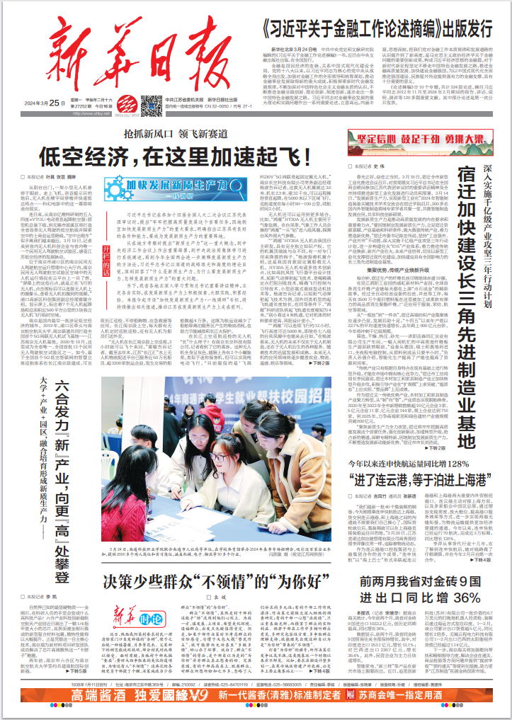 《新华日报》2024年3月25日头版“加快发展新质生产力·一线调研”专栏,刊登“低空经济,在这里加速起飞”文章,抢抓新风口,领飞新赛道。西港娱乐