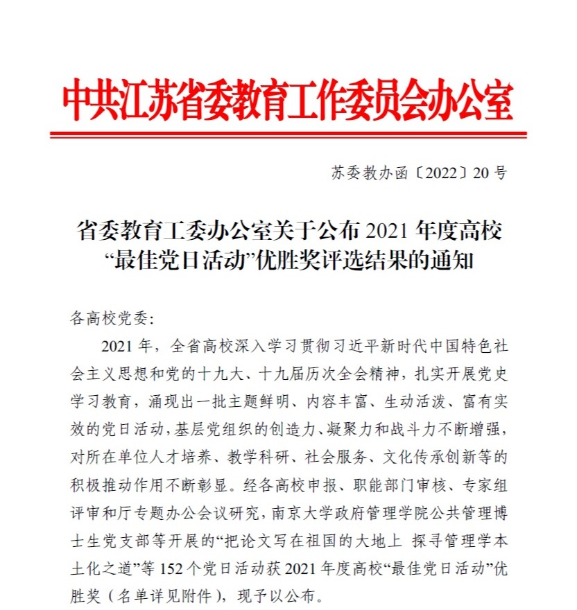 日前,江苏省委教育工委办公室下发了《关于公布2021年度高校“最佳党日活动”优胜奖评选结果的通知》,西港娱乐