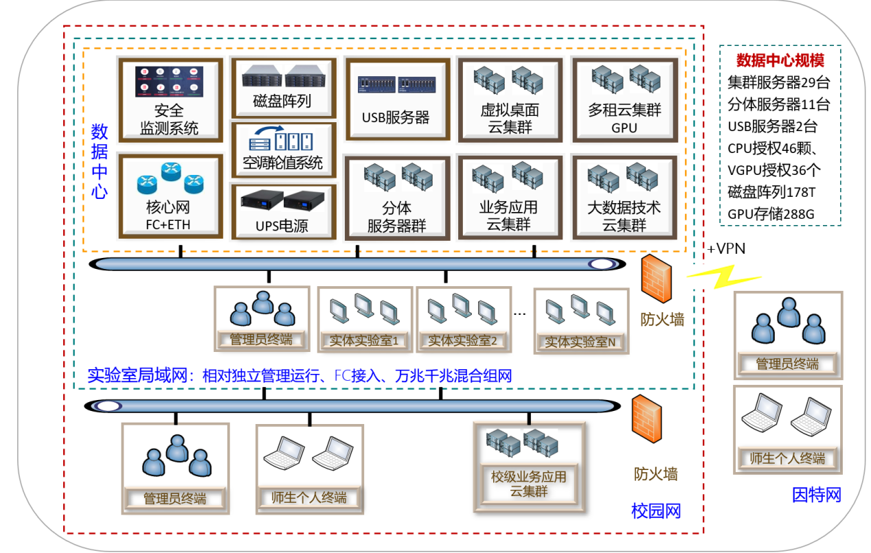 江南大学经济管理综合训练中心(省级实验教学示范中心),现有实验用房1220平方米,仪器设备总值1884万元,拥有1个私有云化数据中心和8个实验分室。数据中心基于云边协同建设了应用服务云集群、大数据云集群、算力云集群和云桌面集群,拥有数字化实验教学软资源798万元。数据中心承载虚拟仿真资源41个,专业数据分析平台4个,专业建模平台2个,BI工具4个,获得虚拟仿真一流课程国家级1门、省级2门。训练中心着力构建数字化学习空间,推动网络化泛在学习,提升学生软技能数字力,推出科学软件类、大数据技术类、专业课程类在线课程35门。